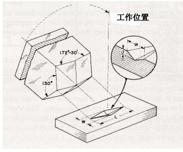 努氏金刚石压头的几何形状是菱形,其纵向内角是172度30分、横向内角是130°。由于这个几何特性,在试验力较小时也能测得较高精度的对角线。另外,努氏压痕的深度很浅,约为长对角线的1/30。由于这个特性,努氏硬度计很适用于薄的涂层、表面硬化层、薄的金属、金属薄片、脱碳层和硬的易碎金属等的硬度。维氏压头是面角136°的正四棱锥金刚石压头,可用来测试那些不适宜用努氏压头进行测量的材料。但是,由于压痕深度比较深,维氏硬度计不能像努氏硬度计一样,适宜测试很薄的金属薄片。
